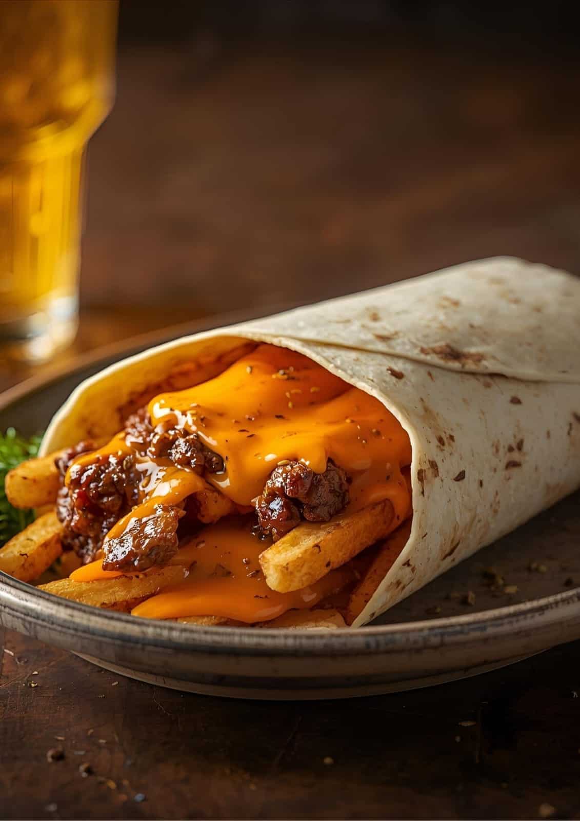 - Fill and wrap: Lay a flour tortilla flat. Layer on beef, fries, and a drizzle of cheese sauce. Add extras like salsa or sour cream if you like.