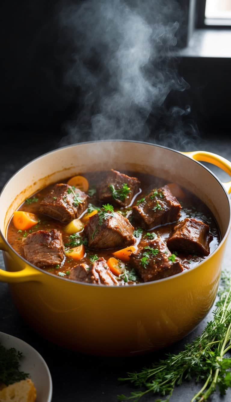 This method of cooking, known as braising, ensures the beef becomes soft and juicy, absorbing the bold flavors of the liquid and spices.