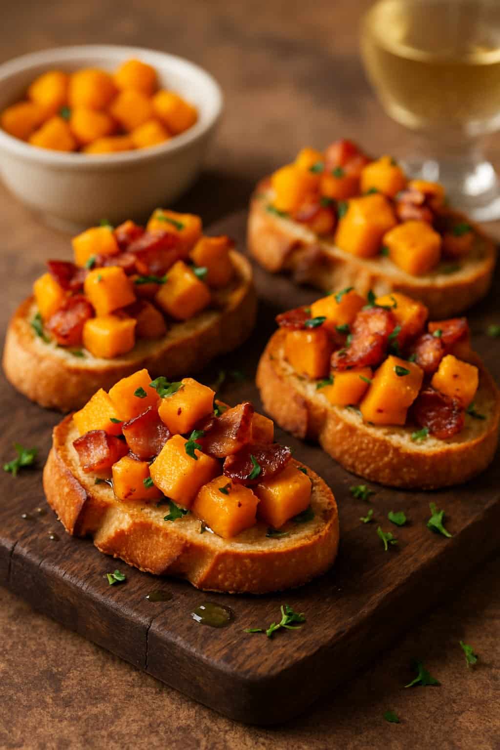 A delicious appetizer featuring roasted butternut squash, crispy bacon, creamy cheese, and herbs served on toasted baguette slices. Perfect for parties or holiday gatherings.