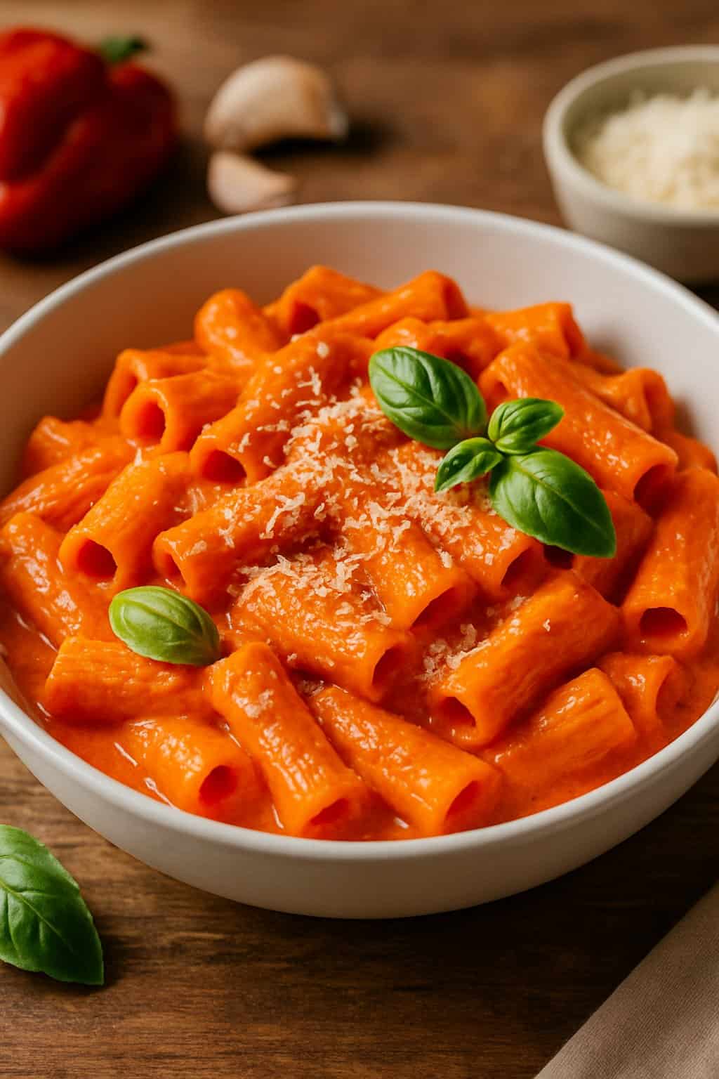 Creamy roasted red pepper pasta gives you a smooth, smoky, and slightly sweet sauce. The sauce coats every bite of pasta and doesn’t need a long list of ingredients.