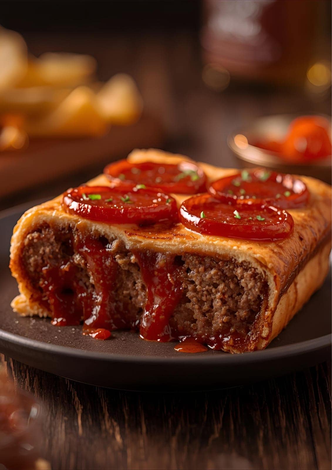 This dish combines ground beef, savory Italian sausage, spicy pepperoni, and gooey cheese all packed into a golden, flaky crust.