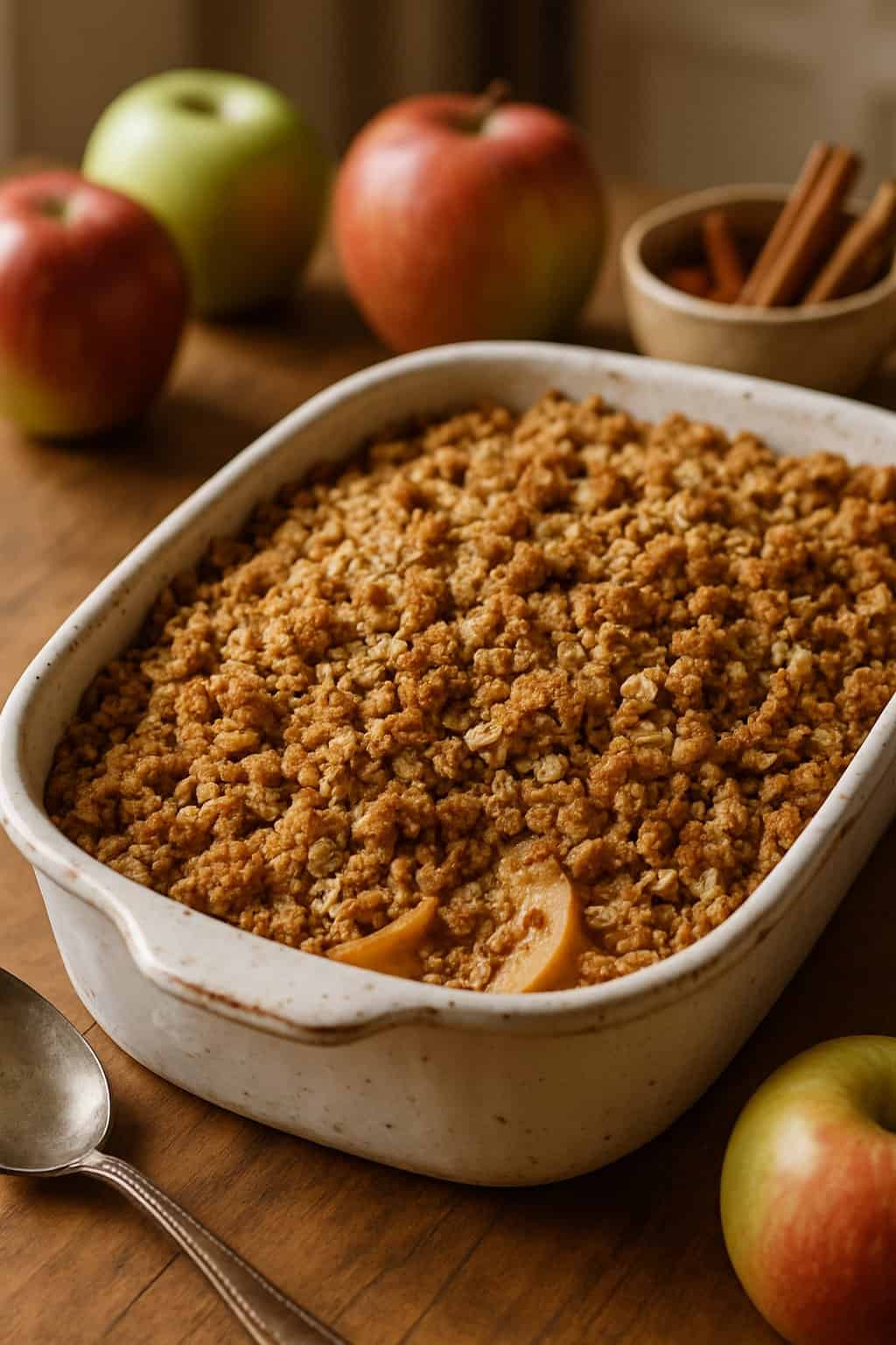 - Bake for 40–45 minutes until topping is golden and apples are tender.