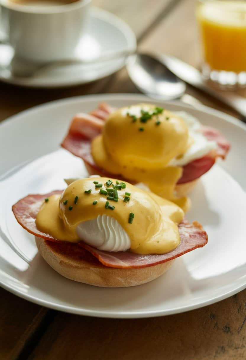 That’s where Eggs Benedict shines. This classic dish gives you a perfect mix of creamy hollandaise, soft poached eggs, and crisp toasted muffins with savory ham or bacon.