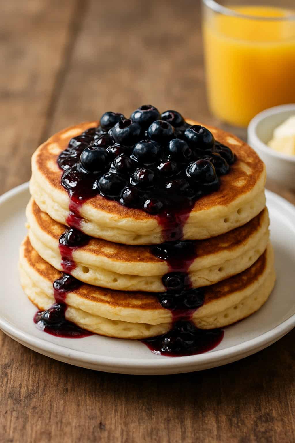 - Serve pancakes stacked high with a generous spoonful of warm blueberry compote.