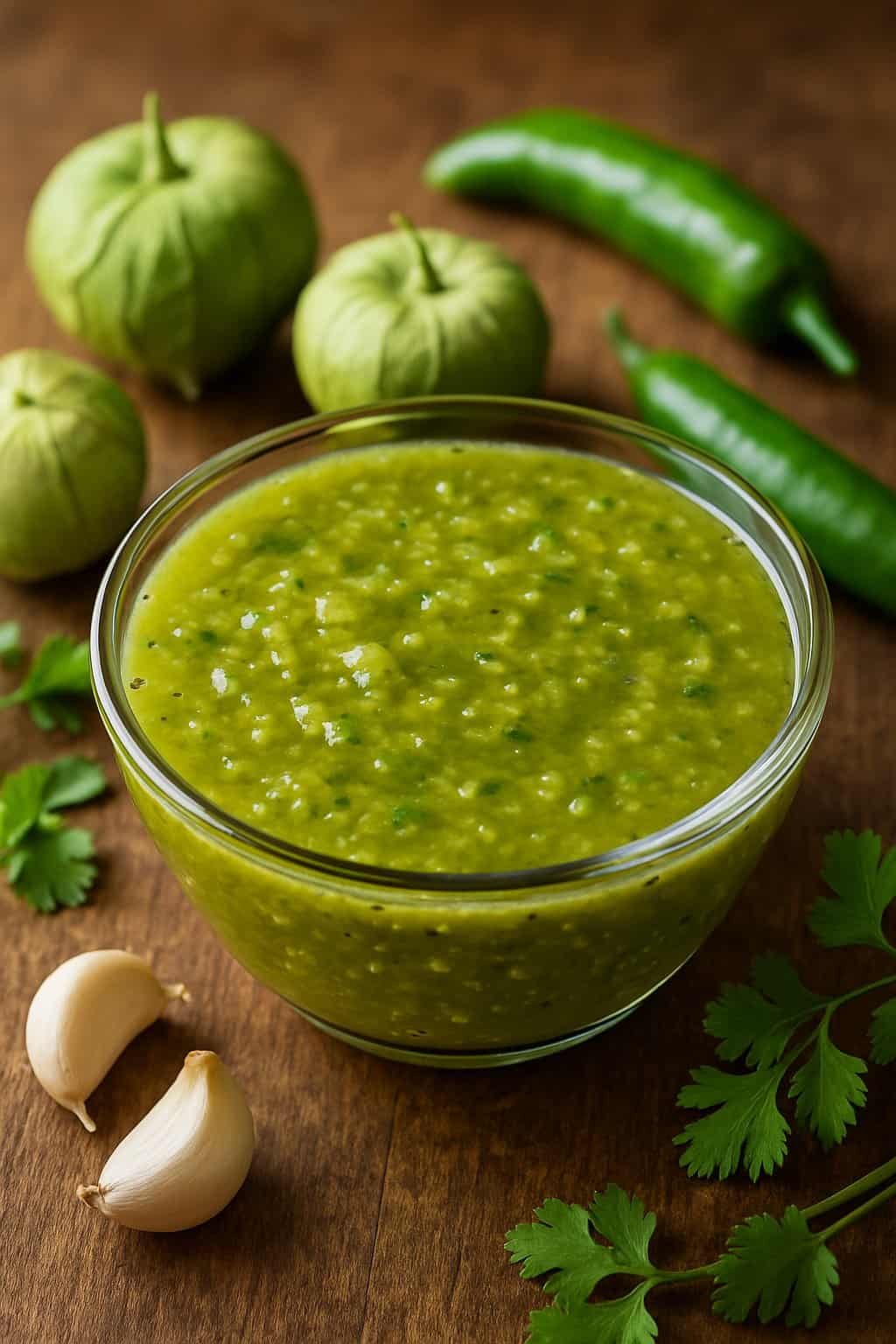 A zesty, tangy Green Enchilada Sauce made with tomatillos, green chilies, garlic, and spices. Perfect for enchiladas, tacos, or as a flavorful Mexican base.
