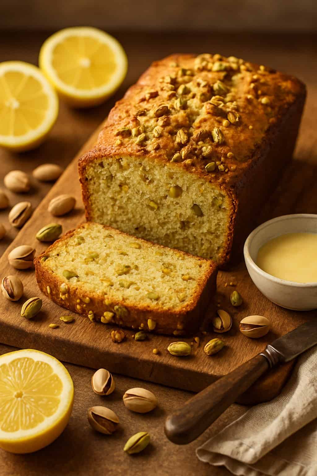 Lemon pistachio loaf cake is a soft, moist cake with a tender crumb, flavored with citrus and nuts, and often finished with a light lemon glaze.