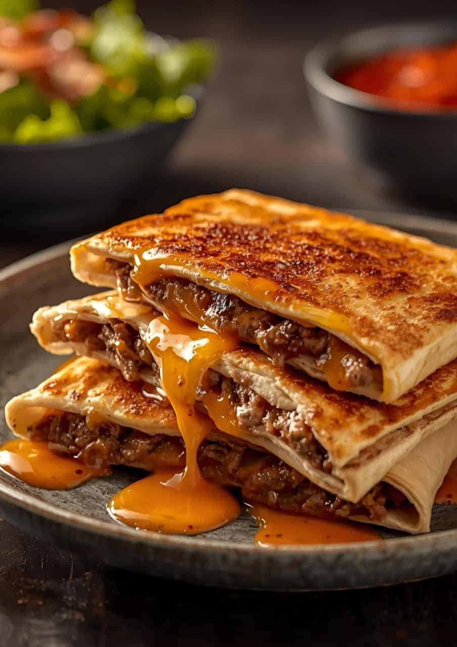 This recipe wraps seasoned beef, crispy bacon, melty cheese, and a touch of maple syrup in a golden tortilla. The dish blends cheeseburger comfort with a subtle sweet kick.