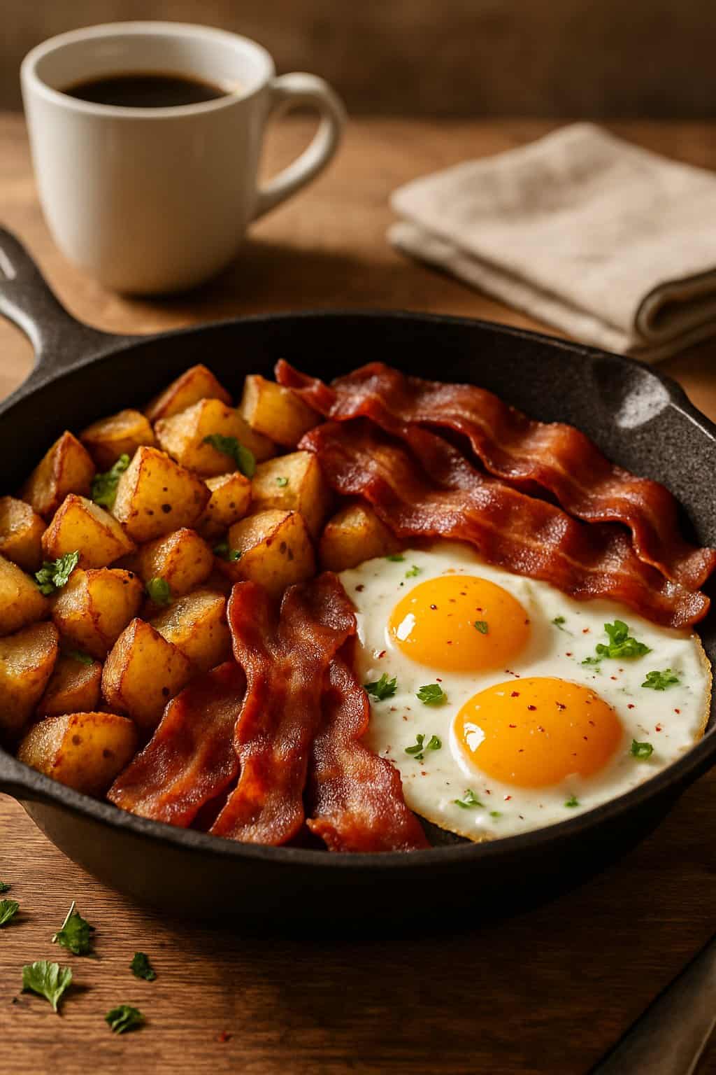 This hearty Potato Bacon Eggs Breakfast Skillet combines crispy potatoes, smoky bacon, and perfectly cooked eggs in one pan for a satisfying start to your day.