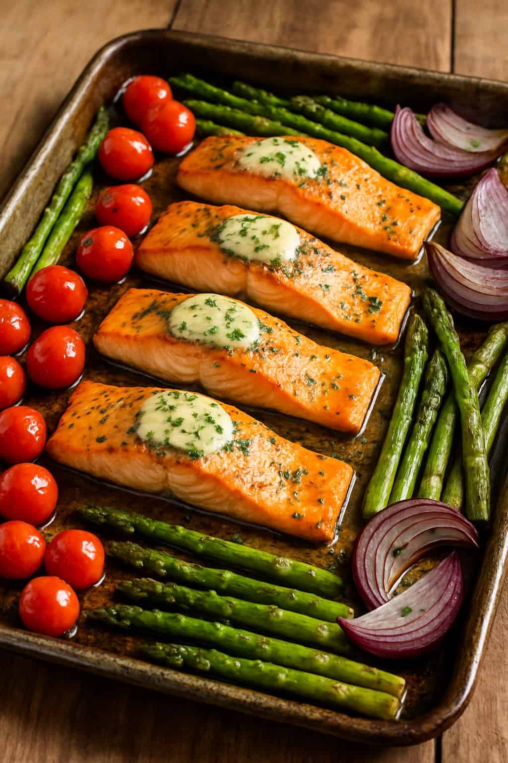 This Sheet Pan Salmon with Garlic Herb Butter is a simple, flavorful, and healthy meal perfect for weeknights. Tender salmon fillets are roasted with fresh vegetables and drizzled with rich, garlicky herb butter for a melt-in-your-mouth experience—all made on one pan for easy cleanup.