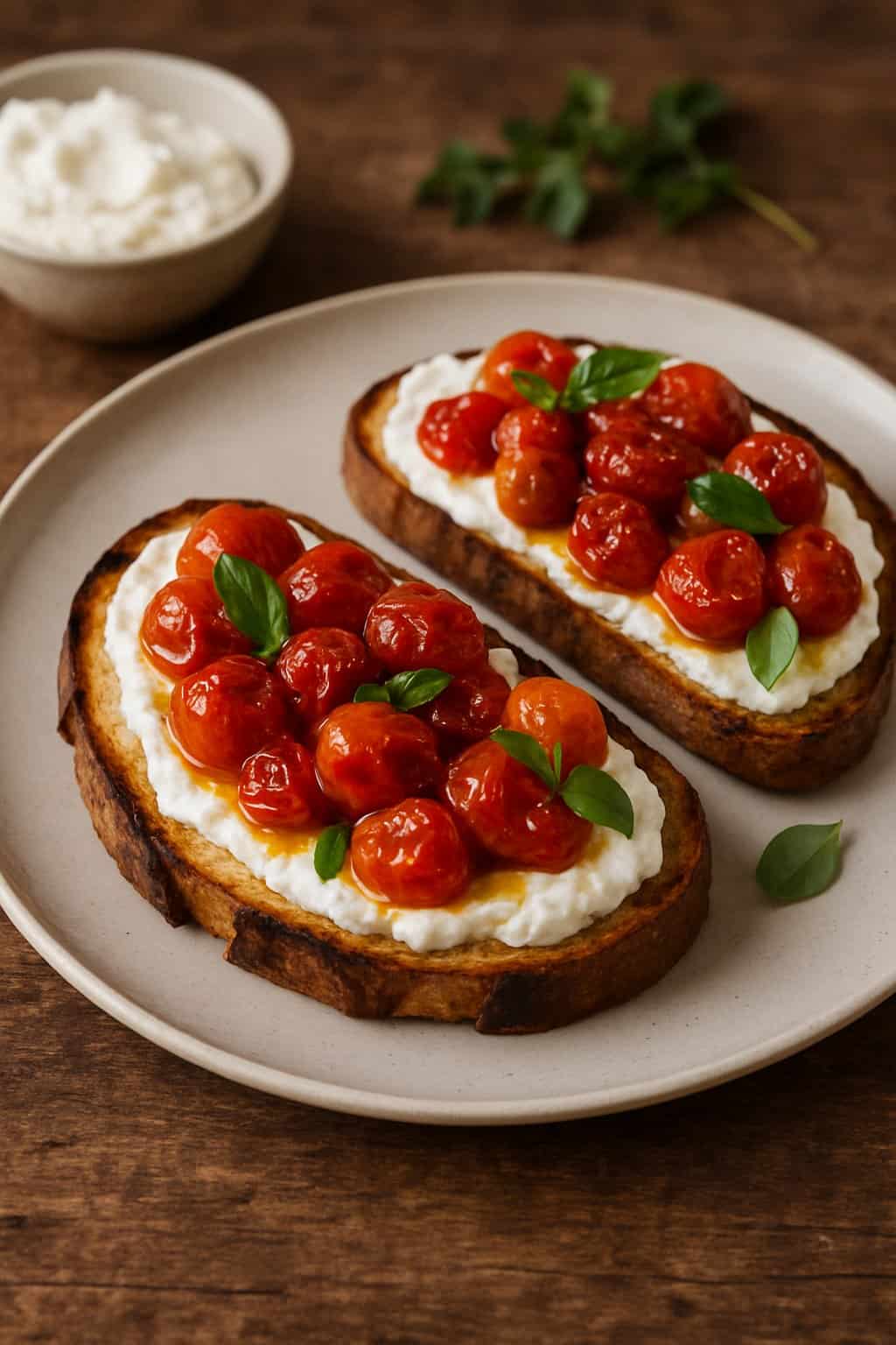 If you want a snack that feels special, this is it. Tomato confit and whipped ricotta toasts give you creamy, savory, and sweet flavors in one bite.